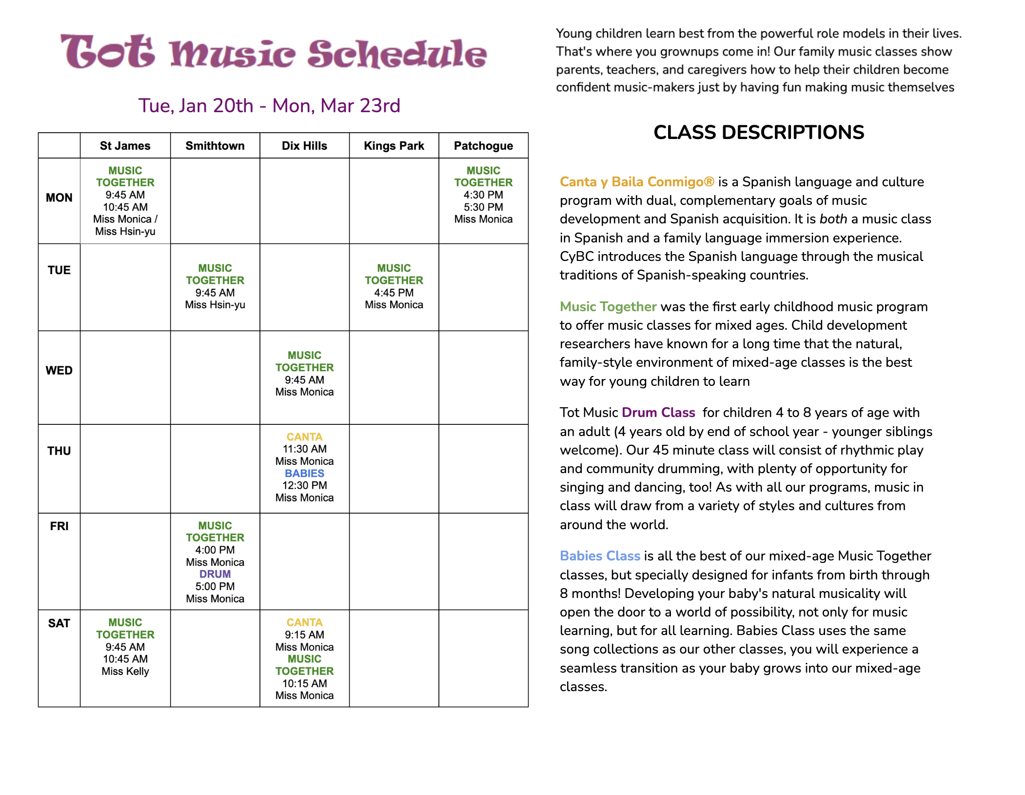 Discover fun, family-style music classes for babies, toddlers, and preschoolers in St. James, Dix Hills, Kings Park, Patchogue, and Smithtown.